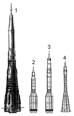 ![]() Kandurraketid Kuu-lennuks: 1 Koroljovi N-1 Kuu-laevaga L-3, 2 Telomei "Proton" samast firmast koos laevaga lendamiseks ümber Kuu, 3 Tselomei "Proton" koos Koroljovi ümber Kuu lendamise laevaga, 4 kandurrakett "Sojuz" (võrdluseks) |